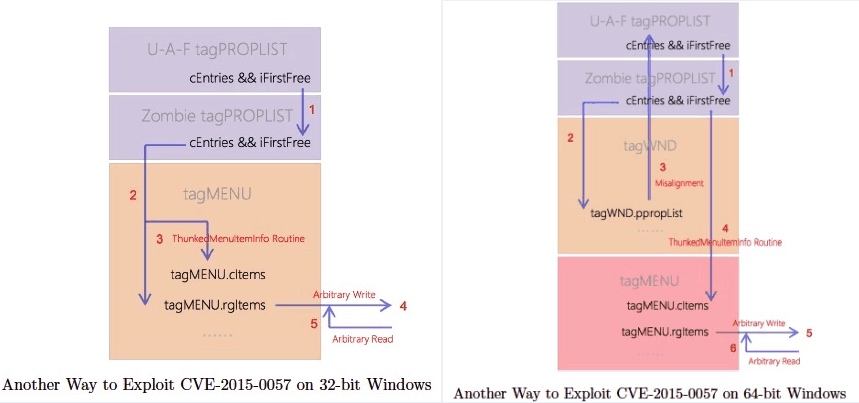 【新型攻击方法】:在32位系统下,== 采用tagMENU对象去填充已tagPROPLIST,然后借助tagMENU.cItems和tagMENU.rgItems来完成控制 ==;而在64位系统下,既借鉴了NCC使用tagWND去操作tagPROPLIST,又使用tagMENU去覆盖tagMENU.rgItems,因为rgItems数组指针指向的第一个元素是wID,通过SetMenuItemInfo()可实现完全控制,最终实现任意地址读写。
