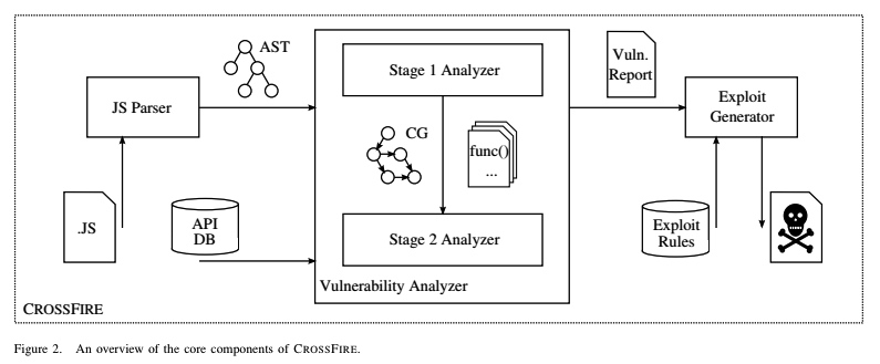 东北大学(美国)的4位安全研究员开发出一款叫CrossFire的轻量级静态分析工具,用于自动化挖掘Firefox插件漏洞(对方称为”Externsion-reuse“漏洞),其实就是利用插件原有的敏感功能去执行恶意行为,比如窃取cookie、历史记录等敏感信息。Firefox插件是通过Javascript调用Friefox提供的API实现的附加功能,因此CrossFire是通过静态分析插件的JS代码,构建出抽象语法树,然后跟收集的敏感API数据库做综合分析,API数据库就是定义输入源(source)和输出目标(sink)的内容,然后基于污点传播的思路去做判断,如果检测到漏洞还可以根据原定规则生成exploit。