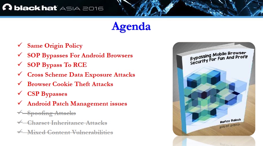 讲述Android浏览器绕过同源策略的UXSS漏洞,都是以一些历史漏洞为例讲解漏洞的利用方式(含PoC),包括窃取cookie、读取本地文件,以及绕过Google Play的限制实现任意app的安装。==议题主要是对过去漏洞的总结,并没有太多新颖的思路。==