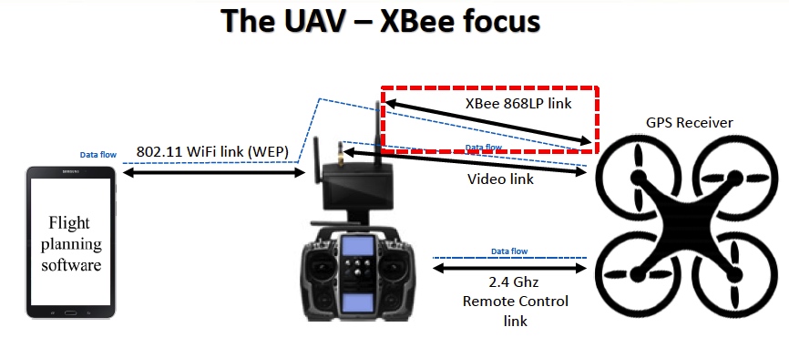 - ==伪造XBee 868LP通讯设备作为中间人==,发送控制指令(逆向Android客户端获得指令序列),从而实现无人机的劫持