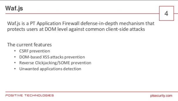 使用Javascript代码去防御DOM XSS、CSRF、点击劫持,以及其它攻击环境检测(Beef、Xbackdoor、Acunetix等等)的工具,与Server组使用js防御dom xss的思路类似,只是多了其它几项功能。文档下载:http://www.slideshare.net/DenisKolegov/wafjs-how-to-protect-web-applications-using-javascript