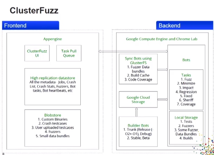介绍Google的分布式Fuzzing系统——CluterFuzz,采用集群服务器进行分布式Fuzzing,大概4000多台机器,不排除使用虚拟机的情况。议题介绍了一些Fuzz变异算法、漏洞类型识别、代码覆盖率问题、自动化精简样本,以及各种sanitizers功能的使用,比较常用的还是Address Sanitizer,且各平台通用。