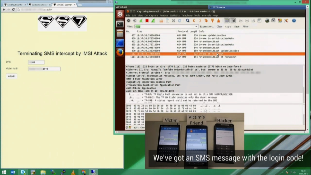 由于当前移动通讯网络采用许多过旧技术,导致一些漏洞遗留其中,主要是针对SS7第7号信令系统的漏洞情况进行统计,其中主要三大威胁是:拒绝服务、信息泄露(比如短信、通话内容、IMEI、地理位置等等)、欺诈。并现场演示短信窃取,实现社交帐号的盗取,并成功获取历史聊天记录。